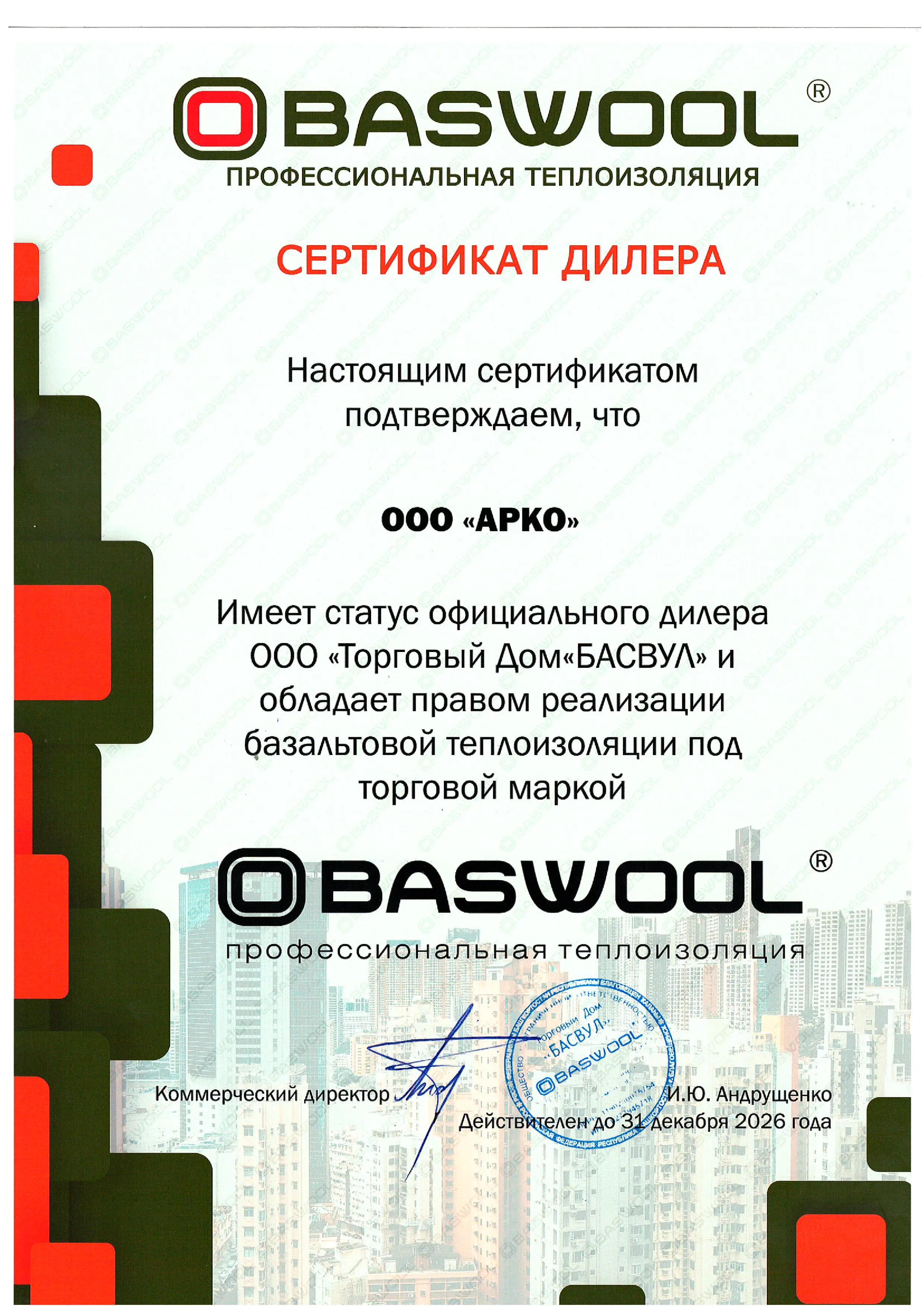 Сертификат дилера Baswool